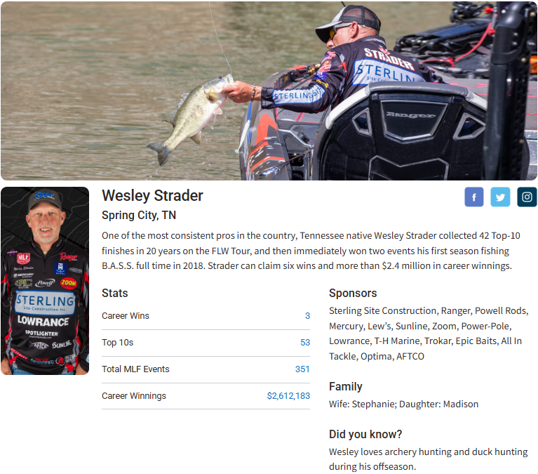 Watch Wesley Strader's latest tournament (starts at 18:45) on Major League Fishing, where he competes against the best anglers in the world. With his skill and determination, Wesley is a force to be reckoned with on the water. Don't miss out on the action - tune in to see how Wesley performs in this exciting tournament!